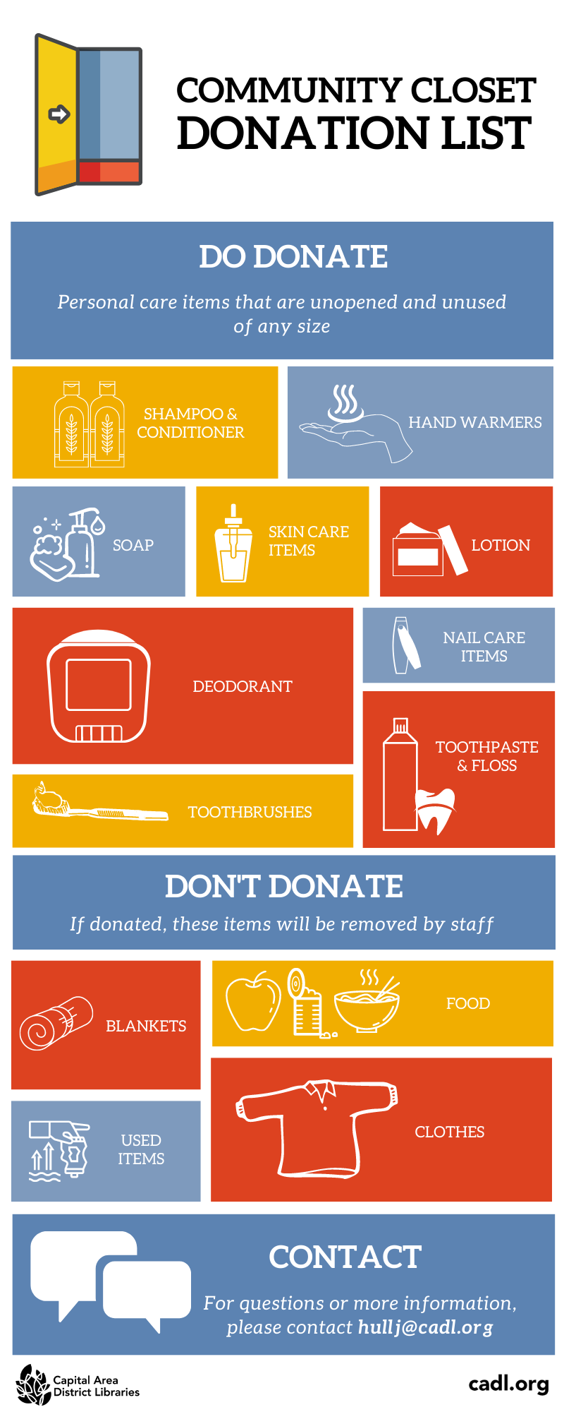 To further meet the needs of our community we also provide a Community Closet in the basement, which contains other hygiene products. Members can visit the Community Closet during open library hours and grab a variety of needed items like toothpaste, toothbrushes, soap and more. If you would like to donate hygiene products for our community, please reach out to Librarian Jay Hull at the Downtown branch at hullj@cadl.org. Here's a list of items the closet is accepting. Of those items, hand warmers and shampoo/conditioner for curly hair is especially needed.